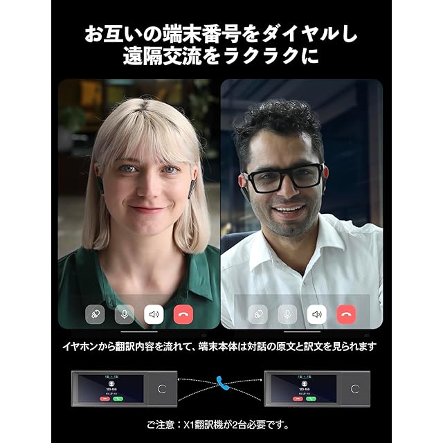 【二台のX1を通話翻訳に】 二人ともX1を使えば、6桁の端末番号をダイヤルして、簡単に遠隔地の相手との会話を始めることができて、同時通訳も可能です。 顧客、同僚、恋人との密接なつながりを維持するのにより良い方法です。通話中、翻訳された音声はイヤホンから流れ、X1翻訳機のスクリンーは母国語と異国語を同時に表示して、臨場感があふれるコミュニケーションが体験できます。遠隔交流をラクラクに!