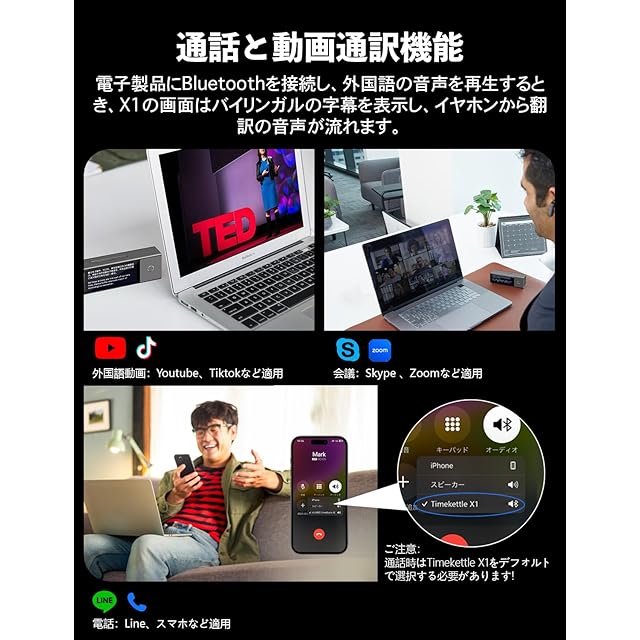 通話と動画翻訳対応:X1翻訳イヤホンは通話と動画翻訳可能な翻訳機です。オンライン会議、外国語の動画、または突然の外国語通話でも、リアルタイムで翻訳を行って、異なる言語間のコンテンツをスムーズに理解し、シームレスに交流できます。 動画翻訳もしくはビデオ翻訳? ビデオ翻訳は、プロフェッショナルな映像(映画、テレビ、ドキュメンタリー、企業ビデオなど)に対して行われる翻訳を指すことが多いです。 動画翻訳は、カジュアルな映像(YouTubeやSNSに投稿された動画、個人的な映像コンテンツなど)に対して使われることが多いです。 IOSのお客様は使用するときにデフォルトのイヤホンをX1を選択してください。
