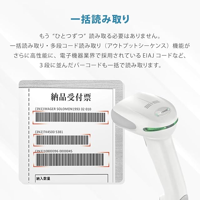 型番:1950GHD-2USB 本体サイズ:(L)104mm × (W)71mm × (D)160mm 重量:本体 160g(ケーブル含まず) インターフェース: USB(HIDキーボード, COMポートエミュレーション) カラー:黒 付属品:スキャナ本体, 接続ケーブル