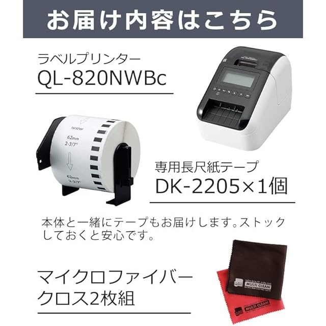 【セット内容】ブラザー QL-820NWBc&テープ DK-2205×1個&クロス
