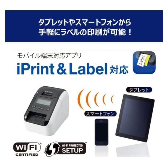 【QL-820NWBc 仕様1】印刷方式:感熱方式、印字解像度:300dpi、印字速度最高:176mm/秒、対応ラベル幅:23mm~62mm、DKラベル9種類、DKテープ5種類