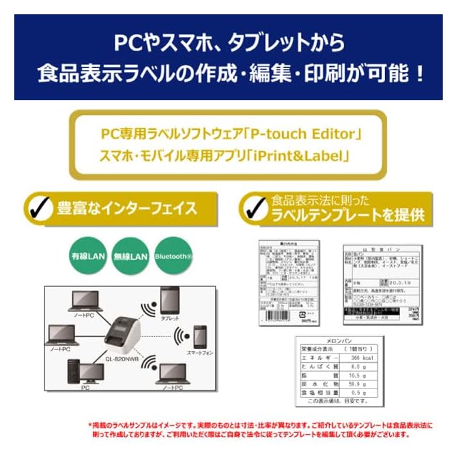 【QL-820NWBc 仕様2】発行モード:テープカッター(本体内蔵自動式)、 インターフェイス:USB Ver.2.0 Full Speed、有線LAN(10/100BASE-TX)、無線LAN(Wi-Fi)、BluetoothR v2.1+EDR対応
