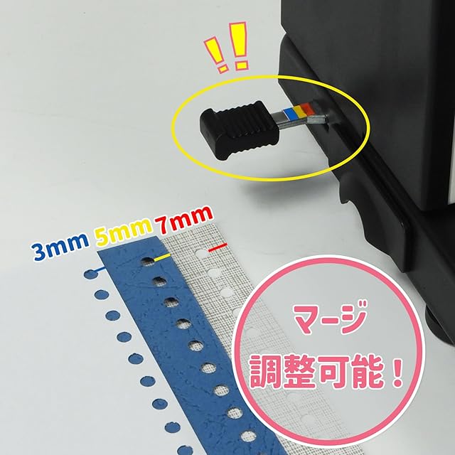 【穴あけ能力】 1-30穴自由に調節する。A4/B5 およびA5に対応、最大15枚パンチ可能(80gsm)。厚さ0.2mmのPPまたは230gの革紙、最大2枚パンチ可能。