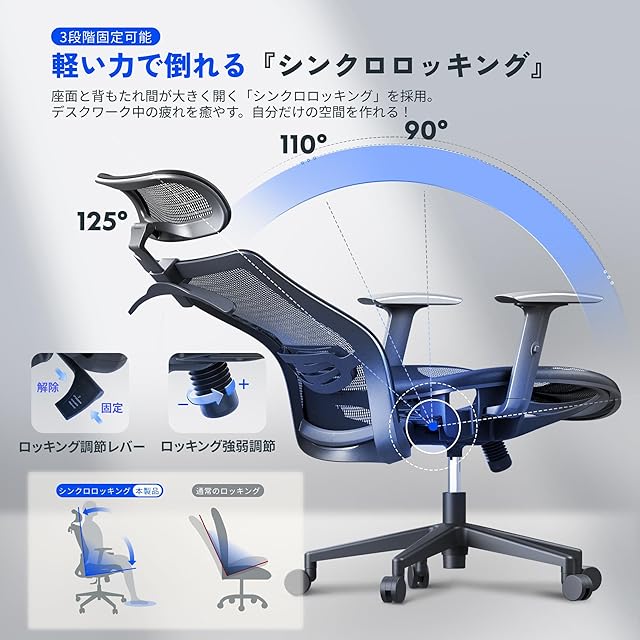 【シンクロロッキング・3段階固定可能】125度までロッキングでき、自然な身体の動きや体重移動に合わせて背もたれと座面が動き、体を支えてくれる。体重によるロッキング強弱調整にも対応。3段階固定可能で、シーンに合わせてお好みの角度に調節できる。