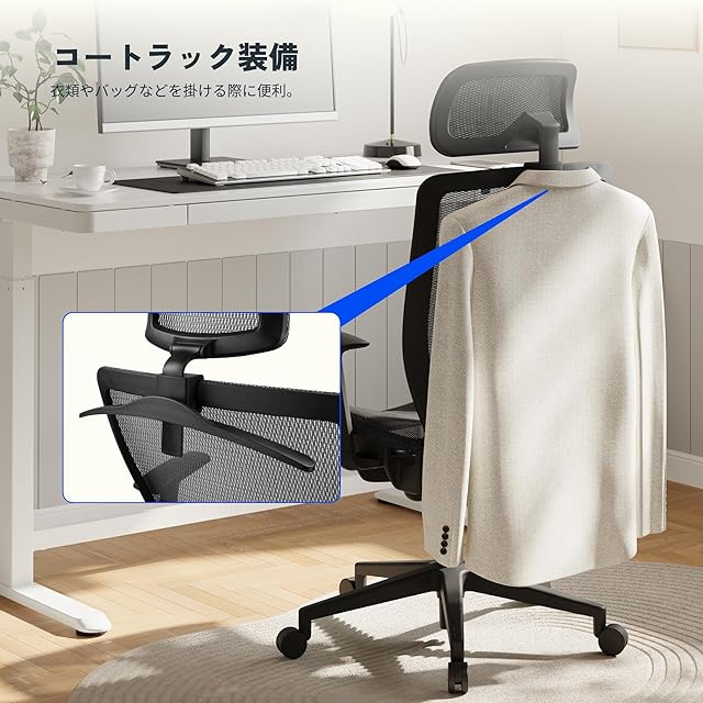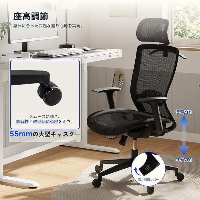 【移動に便利な静音キャスター・コートラック付き】シートの高さは47-57cm間で調節可能で、直径5.5cmのちょうどいい大きさのキャスターを搭載。床にも優しく静音性と軽い使い心地を両立。さらに背面にはコートラックが備えられ、衣類やバッグなどを掛ける際に便利。