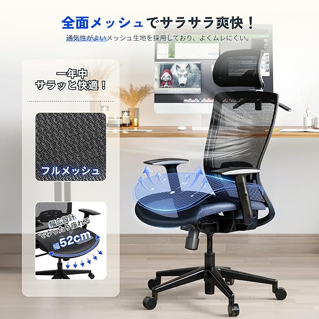 【全面メッシュでサラサラ爽快・幅広設計でゆったり座れる】通気性がよいメッシュ生地を採用しており、よくムレにくい。座面幅約52cmと非常にゆったりとしたサイズ、様々な体型の方に座れる。一年中サラッと快適に過ごせる。