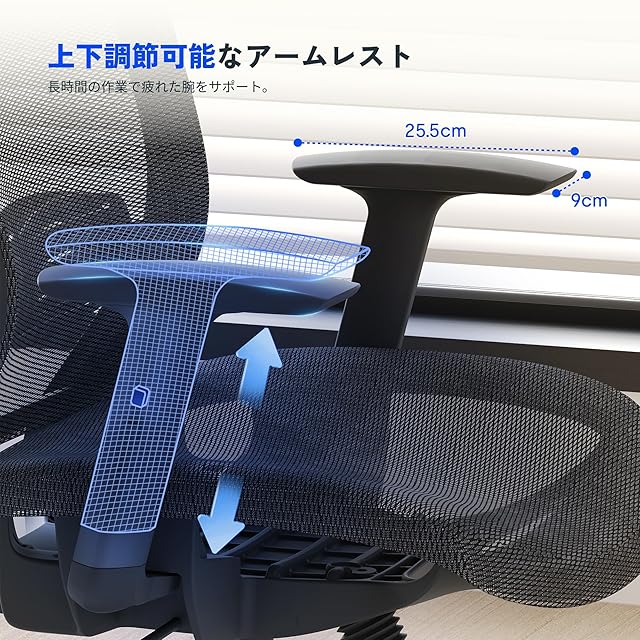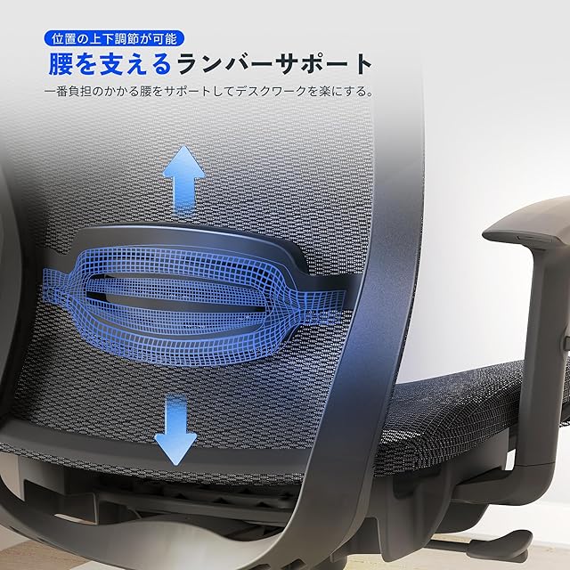 【上下調節可能なアームレスト・腰を支えるランバーサポート】アームレストは上下調節可能で、長時間の作業で疲れた腕をサポート。一番負担のかかる腰をサポートしてデスクワークを楽にするランバーサポートを搭載。位置の上下調整も可能。