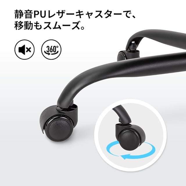 【素材と機能】通気性の良いポリエステルメッシュ素材と耐久性に優れたポリプロピレンを使用。3Dヘッドレストと収納式フットレスト、可動式アームレストも装備し、静音PUレザーキャスターで移動もスムーズです。静かで傷つきにくいキャスターは、フローリングでも安心して使用できます。