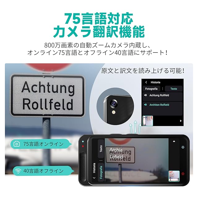 【カメラ翻訳】内蔵カメラで簡単撮影!写真の文字を自動で翻訳します。オートフォーカスだから取り損ねも防ぎます。専門の会議録音アシスタント、先進的なスマート音声認識エンジンにより、異なる言語のメニュー/道路標識/雑誌/ラベル/新聞をすばやく読むことができます。
