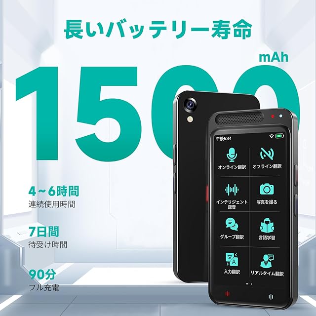 主な搭載機能:オンライン翻訳、オフライン翻訳、カメラ翻訳、録音翻訳、リアルタイム翻訳、入力翻訳、言語学習、グループ翻訳、ChatGPT、為替レート変換、単位変換、世界時計、Bluetooth接続、翻訳結果自動保存など