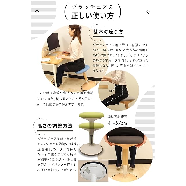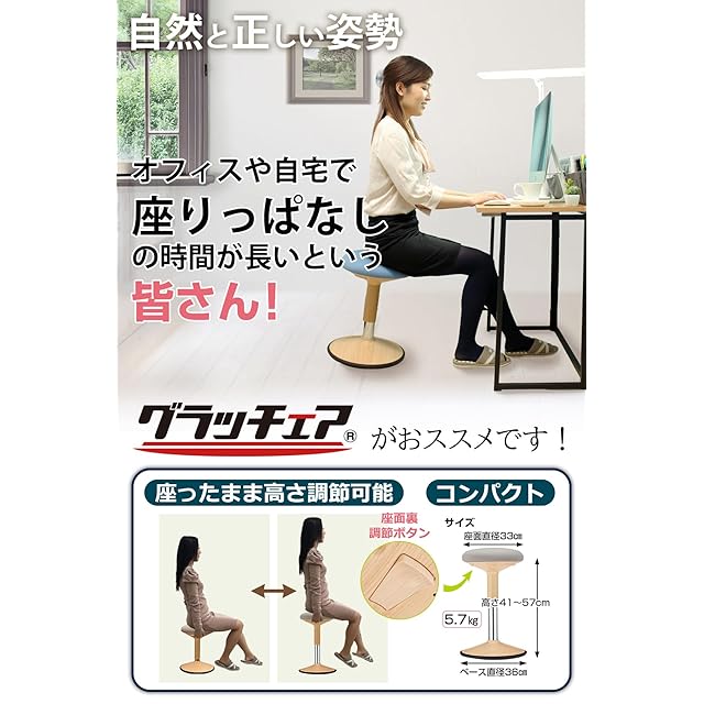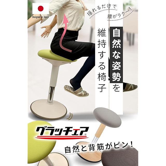 【座りながらストレッチ】正しい姿勢でも、同じ姿勢を続けていたら筋肉が固まって疲れてしまいます。グラッチェアなら、座ったまま腰回りを軽く動かすだけで、前後左右斜めに自由に傾けてストレッチができます。