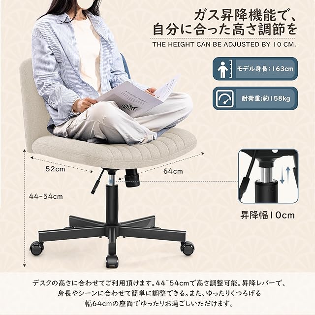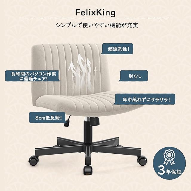 FelixKing デスクチェア あぐら 椅子 オフィスチェア 肉厚座面 布張り ソファチェア 肘掛けなし 疲れない 座面広い ホイール付き回転 10cm高さ調節可能 回転軽快な小型のソファ 一人掛け 小さなスペース 90°~120°ロッキング角度 キャスター付き パソコン 事務 学習 勉強 在宅 ワーク おしゃれ ベージュ