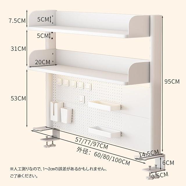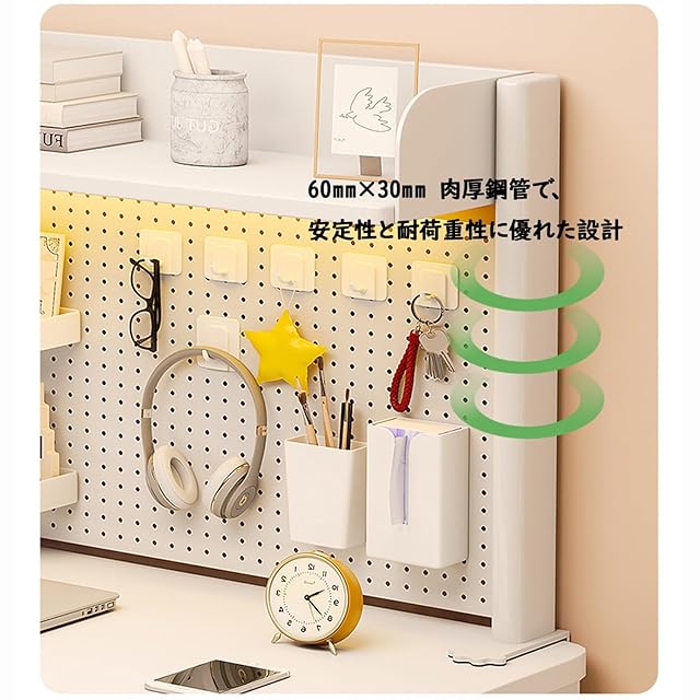 【有孔ボード】この机上ラックの大きな特徴は、有孔ボード設計を採用していることです。これにより、イヤホンやキーなどの小物をフックやマグネットで自由に固定できます。小物の保管がしやすく、デスク上の整理に大変便利です。しかもこの有孔ボードにより、デスク上の空間を自由にカスタマイズできます。自分好みのレイアウトを作り出すことで、個性的な机まわりを演出できるのが魅力です。DIY性の高さが、この収納ラックの大きな武器となっています。