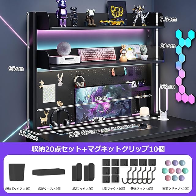【豊富なアクセサリ】この収納ラックには、様々なアクセサリが標準で付属しています。収納ボックスやU字フック、Lフック、マグネットなどが含まれており、小物の整理に役立ちます。これらのアクセサリを活用することで、デスク上の空間をより有効に活用できます。