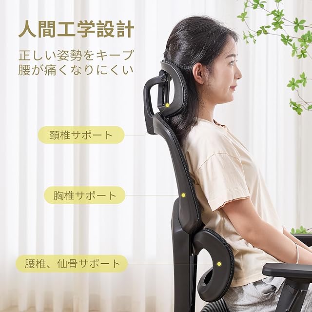 【3Dヘッドレスト・頭の動きに合わせる】頭の重さは体重の約10%と言われており、長時間使用するワークチェアは頭部を適切に支えることが大切です。UPHYBは高弾力のヘッドレストで、どのような姿勢で座っても、頭と頸部をゆったり預けることができます。上下高さ5段階に調節可能でご自分のお気に入りに調整できます。さらに角度調整機能があって、頭の動きに合わせたり連動する。