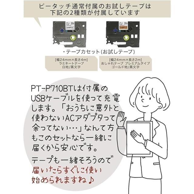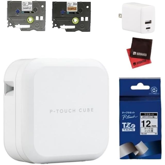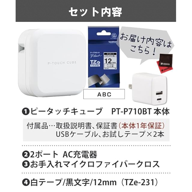 ピータッチキューブ ブラザー ラベルライター [PT-P710BT] & テープ [TZe-231 12mm] & AC充電器 & クロス (4点セット)