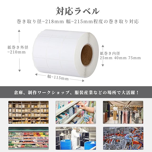 【多様な紙管径で幅広いラベルサイズ対応でき】紙管内径は25mm/40mm/75mmで、範囲以内でのラベルを楽に対応でき。