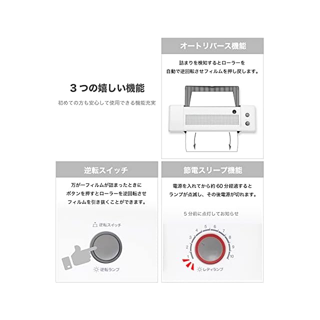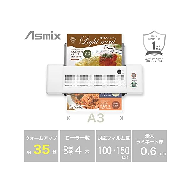 アスカ ラミネーター 4本ローラー L410A3 ウォームアップ35秒 A4加工最速33秒 オートリバース 150ミクロンまで ホワイト