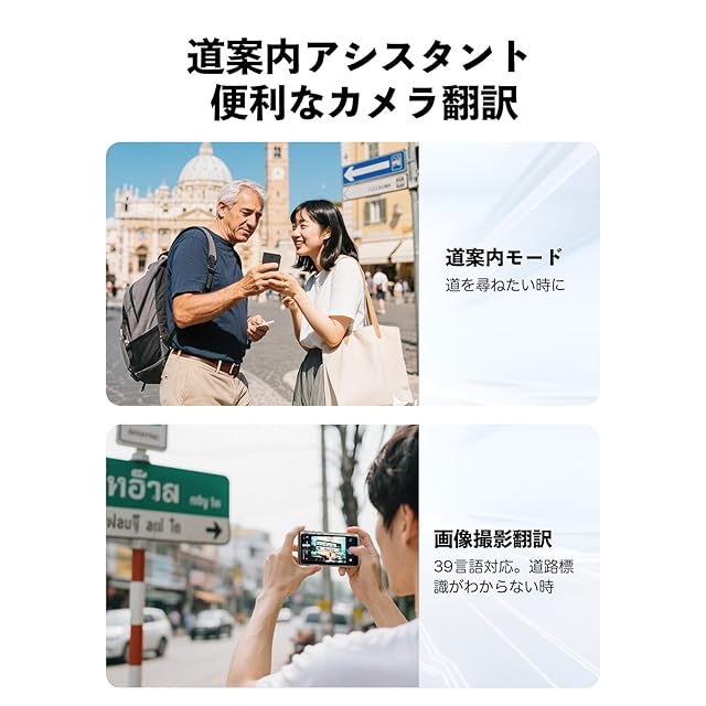 多機能&実用性重視: 海外旅行、移住などのあらゆる場面に備えた。ワンタップ翻訳モード:目の前の相手と手早く会話(翻訳)ができます。聴講モードに素早く切り替えて、周囲のあらゆる音声を自動に翻訳できます。チャットモード:面倒なボタン操作不要、双方向の会話を同時翻訳。画像撮影翻訳:読めない標識、メニューが一目でわかるように。横向きモードを利用して、テキストをよみ読みやすい。