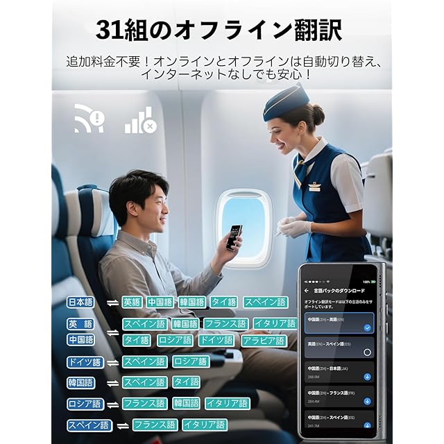 31組オフライン翻訳対応、グローバル通信2年付き:SIMカード不要!ネットワーク接続無しで、31組のオフライン翻訳をサポートします。オフライン翻訳は【日本語⇄英語・中国語・韓国語・タイ語・スペイン語】などの31組を含めています。ご注意:オフライン翻訳の機能を使用する前に、オフライン言語をダウンロードする必要があります。