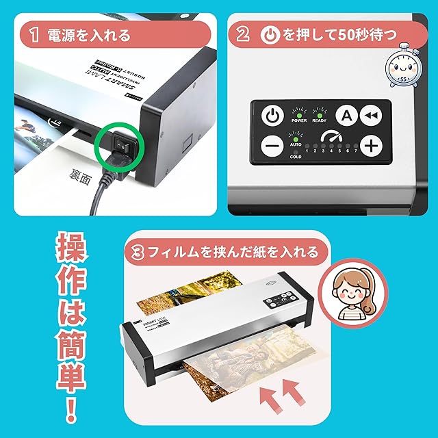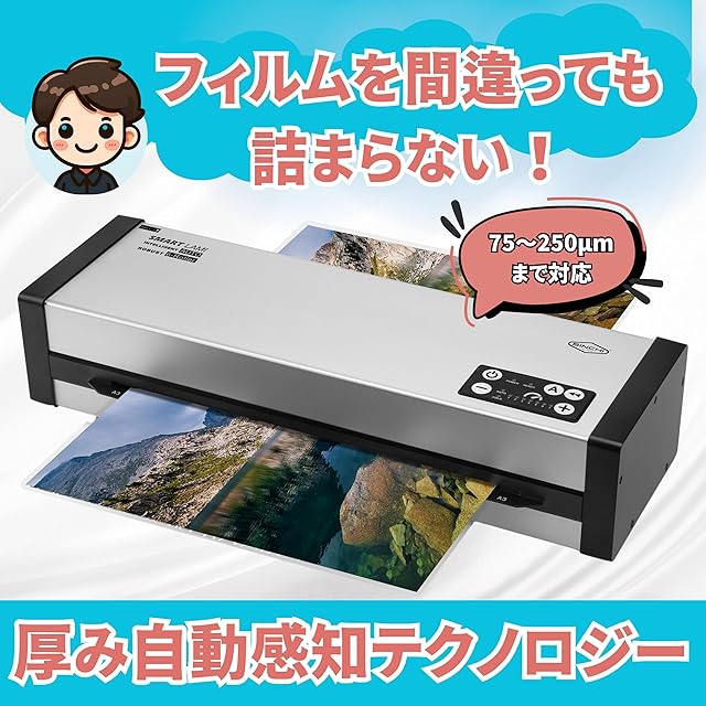 【特許取得済みの自動感知テクノロジー】厚みの自動感知により、フィルムや文書の仕様に注意を払う必要がなく、機械が自動的に設定を最適化します。本機には、フィルムの厚さ自動検出と手動選択の2つの機能があります。 ユーザーは、自動検出モードのラミネーション品質を最適化するために、減速ボタン(-)または加速ボタン(+)を押してラミネート速度を調整することができます。フィルム上に白い気泡がある場合は、「-」を押してラミネート速度を落とし、ラミネーションを濃くしてください。波打った仕上がりになる場合は、「+」を押してラミネート速度を上げることで波打ちを抑えます。