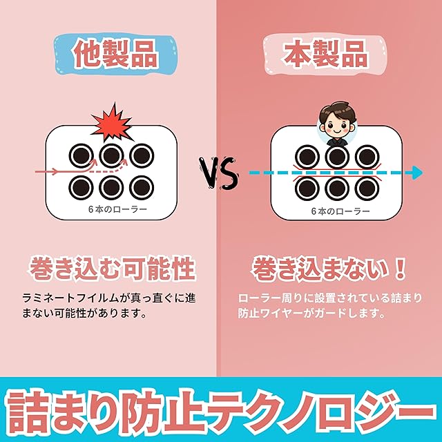 【特許取得済みの詰まり防止テクノロジー】ローラーの詰まり防止設計により、詰まりはほとんど起こりません。ラミネーター フィルムが不適切に挿入されても、ほとんどの場合でラミネートが完了され、仕上げも許容範囲です