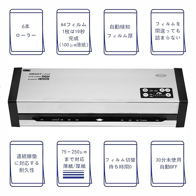 SINCHI 6本 ローラー ラミネーター A3 ラミネート機械 A3/A4/B5/名刺サイズ 75/250μm対応 50秒の高速ウォームアップ/1分間最長1.2mのラミネート速度 【厚み自動感知 & 詰まり防止機能】搭載 高い耐久性 ビジネス 学校 家庭 業務用 写真や文書の保存にも最適