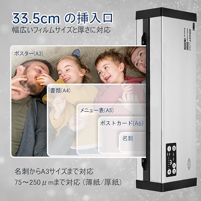 【幅広く対応】横幅33.5 cmの挿入口は、ID カードから A3 サイズまで、そして 75 ~ 250 μm (薄紙と厚紙)のすべての標準フィルムを挿入可能です