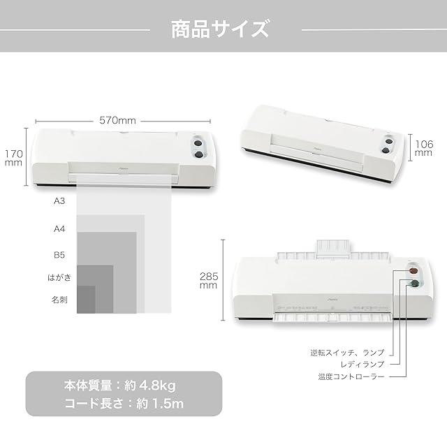 【商品仕様】ウォームアップ時間:約45~165秒間、最大ラミネート厚:0.6mm(フィルムの厚さ含む)、最大ラミネート幅:325mm(A3サイズ対応)、外形寸法(※突起部含まず):W570×D170(トレー使用時285)×H106mm、質量:約4.8kg、付属品:取扱説明書・保証書(1年間)