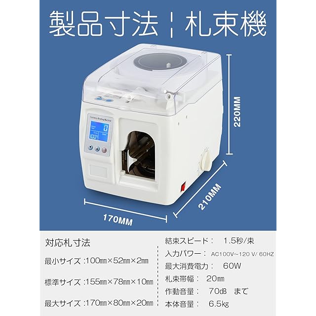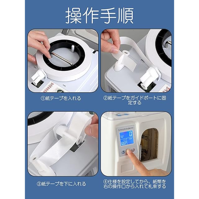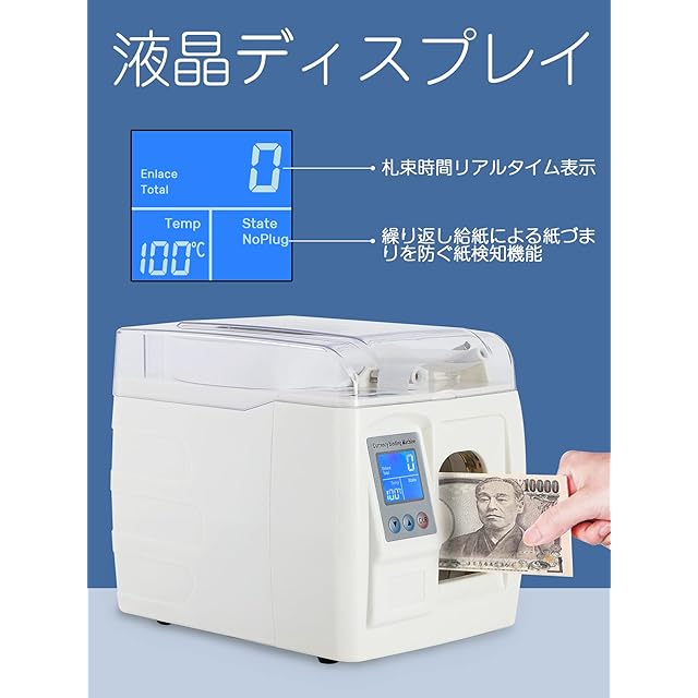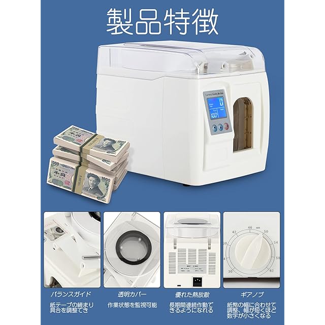 【LCD表示画面・札束テープ付き】すばやくに機械の状態、束数および動作温度を読み取れます!厚さ2cm、高さ8cmまでの紙幣を束ねることができます!マシン内に札束テープが付属しており、追加購入なしで到着したらすぐに使用できます!