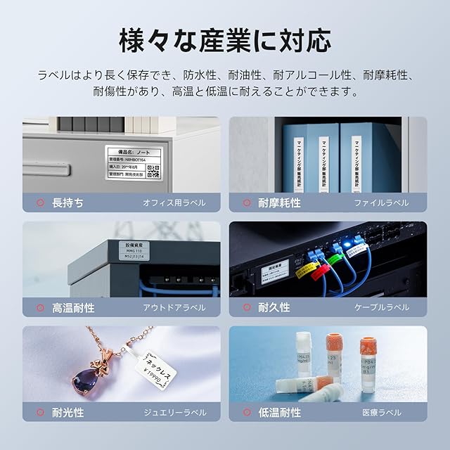 【カラーラベル】20-50mmの印刷幅、自動ラベル認識、自動用紙返却、および校正機能は、ユーザーがラベルと時間を節約するのに非常に優れています。値札、個人品の識別、食品の日付マーク、ケーブルの識別などに最適です。オフィス文書をより目を引き、整理します。