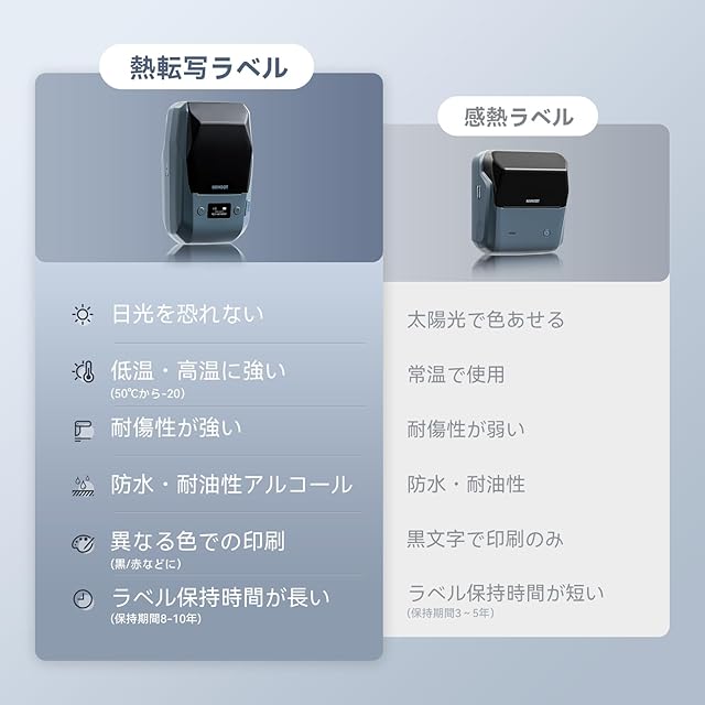 【熱転写印刷】熱転写の印刷原理を改良し、リボンを使用することで、印刷文字が8-10年色あせずに保存でき、耐久性がより強く、より心配の使用をマークします。感熱プリンターと比較して、ラベルはより長く保存でき、防水性、耐油性、耐アルコール性、耐摩耗性、耐傷性があり、高温と低温に耐えることができます。