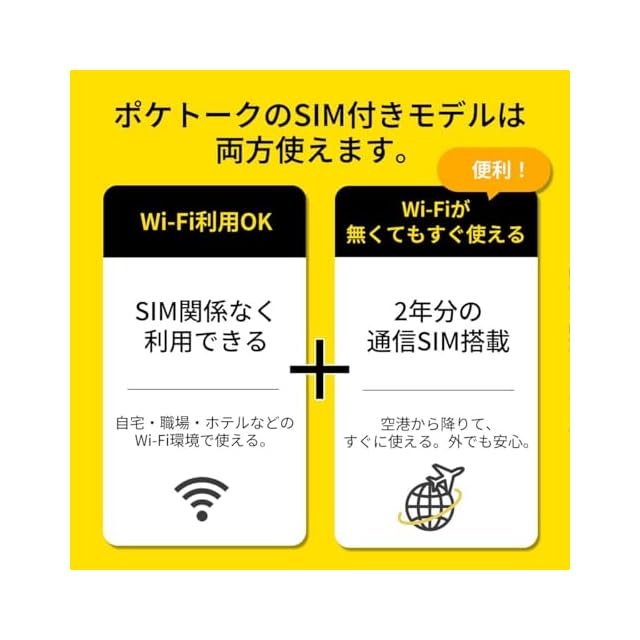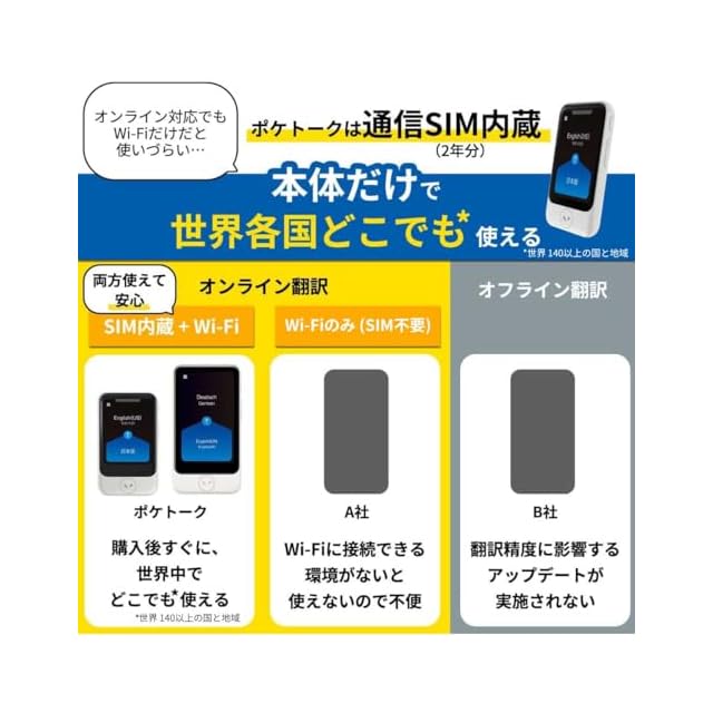 【難しい設定不要、2年分の通信費用がセットに】ポケトーク本体は、2年分の通信費用がすでに含まれています。 追加料金や難しい設定を行う必要なく、電源を入れてすぐに世界140以上の国と地域でご利用いただけます。 Wifi接続でのご利用も可能です。