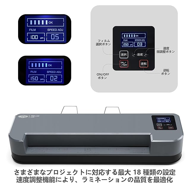 【LCD表示のコントロールパネル】フィルムの厚さに応じて選択することができ、非常に便利です。速度微調整ボタンは、ラミネーションの品質を最適化します。