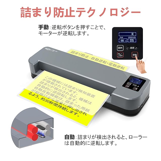 【詰まり防止テクノロジー】自動または手動でローラーを逆回転させ、詰まりを防止します。自動:詰まりを検出するとローラーが自動的に逆転します。手動:逆転ボタンを押すことで、モーターが逆転し、詰まったフィルムを挿入口から押し出します。