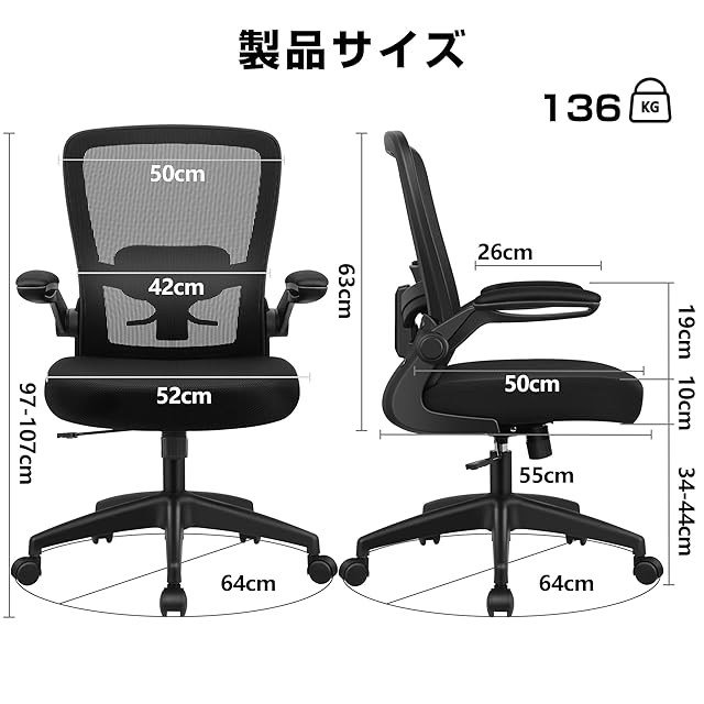 【跳ね上げ式アームレスト・省スペース】FelixKingオフィスチェアが使用完了になりましたら、アームレストのを跳ね上げると、デスクの下に収納しています。デスクチェア座面の高さは45~55の範囲で調節可能、ご自身の使いやすい高さを自由に選択しています。