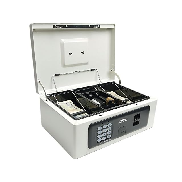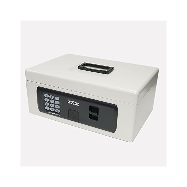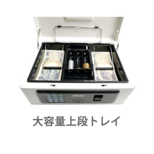 テンキータイプのキャッシュボックス(手提げ金庫)。上段トレイにはたっぷりの小銭、お札が収納でき、トレイの下にも通帳、印鑑、札束等を大容量に収納可能です。キーが不要のテンキー暗証番号式。暗証番号は1桁から最大8桁まで設定可能な為、簡易的な使い方から8桁暗証番号の強固なセキュリティ運用まで、お客様の用途に合わせてお使い頂けます。 大容量キーボックス等と同様の、板厚20mmのボディ部分、板厚1mmのフタ部分、取っ手は金属製のハイセキュリティ仕様です。