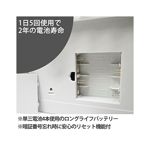 テンキーの最大のメリットは※キーの紛失が無い ※いつのまにか合鍵が作製される事がない ※鍵の管理が不要 ※多人数運用時の利便性 など様々ございます。テンキー式なら暗証番号はお客様自身で簡単に変更可能です。電源コード不要の電池式。単3アルカリ電池を4本使用する為、電池寿命は1日5回使用で2年間、1日10回使用で1年間のロングライフ設計。電池寿命が少なくなっても、アラーム音でお知らせがあり安心です。「エボルタ」、「エナジャイザー」等の長寿命電池を使えば更に長持ち致します。