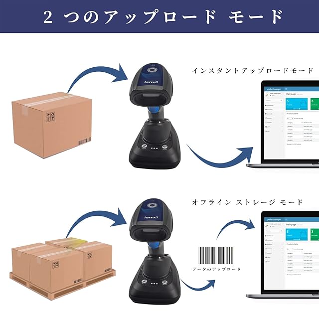 【スクリーンスキャンをサポート】Bluetoothバーコードリーダーは高度なデジタル画像収集機能を備えており、スマホやノートパソコンのスクリーンから直接バーコードを読み取ることができます。インスタントアップロードモードとオフラインストレージモードにより、最大150万件のバーコードエントリを保存することができ、様々な環境で非常に効率的に使用することができます。