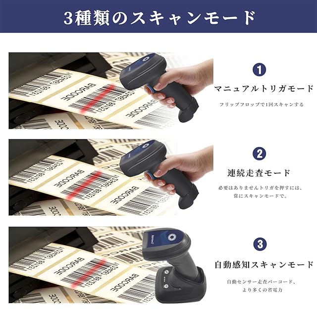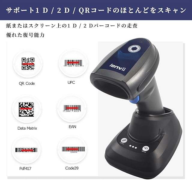 LENVII Bluetoothワイヤレス2Dバーコードスキャナー、USB有線/Bluetooth/無線 QR バーコードリーダー、充電ドック付きバーコードリーダー 日本語対応、2次元 1次元 QR スキャナ MAC OS、Windows、iOS、Androidに対応