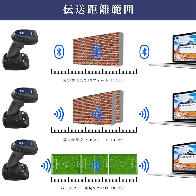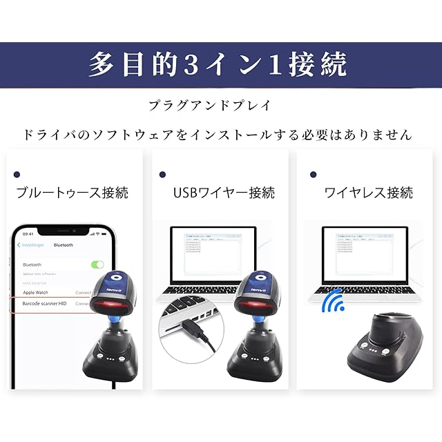 【3-in-1接続】ワイヤレスバーコードスキャナは、USB有線接続、2.4Gワイヤレス接続、Bluetooth接続などの多彩な接続オプションに対応しています。ノートパソコン、PC、携帯電話、タブレットと簡単に接続できます。Windows XP/7/8/10、Mac OS、Windows Mobile、Android OS、iOSに対応し、あらゆるセットアップにシームレスに統合できます。