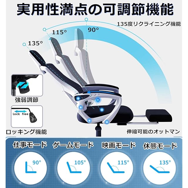 【フルメッシュで一年中快適】オフィスチェアの背もたれは競技用メッシュ素材を採用して、よりよい伸縮性があり、通気性に優れています。夏場や暖房の効いた冬場でも蒸れずに快適な座り心地を実現します。それに座面は高反発ウレタン素材を採用しており、心地よいクッション性があり、リラックス効果が抜群で、ソファのように包み込まれる快適な座り心地が体験できます。テレワーク用、勉強用、在宅ワーク用、様々な場合で活躍です。