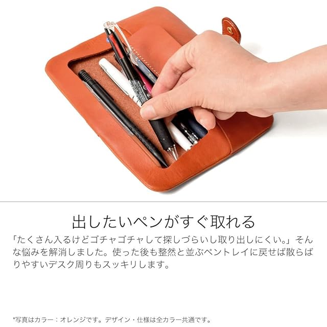 【デザインと機能性】日本最高峰の栃木レザーを使用したペンケース。蓋を広げればペントレイとして機能し、使いたいペンがすぐ見つかる設計で、散らかりがちなデスク周りもすっきり整頓できます。複数の筆記具と文房具を使い分ける大人の筆箱的ペンケースです。