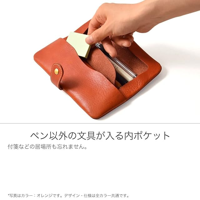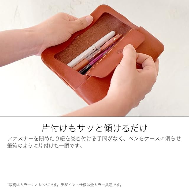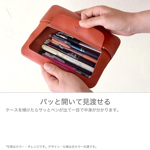 【スマート×大容量】コンパクトながらペン8本や定規、消しゴムなど豊富な文具をスマートに収納でき、細かな文具を分けられる内ポケットも完備。フラップを使い、傾けるだけで一瞬でペンを出し入れ可能。ファスナー開閉の手間なくスムーズです。抜群の使用感と本革の心地よさが魅力です。
