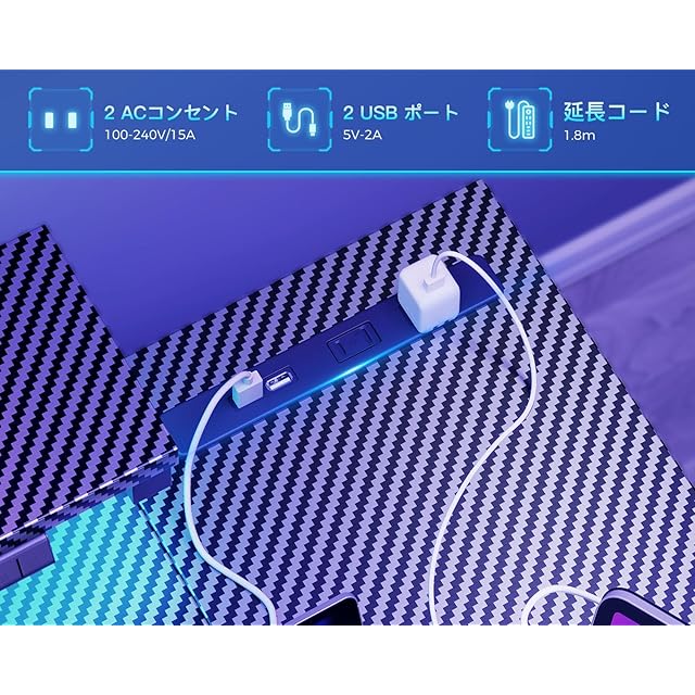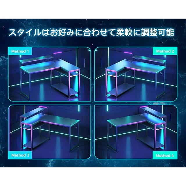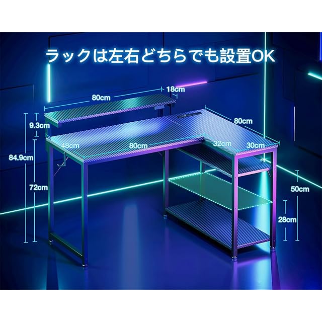 AODK ゲーミングデスク コンセント付き パソコンデスク l字デスク LEDライト付き デスク 机 幅110 pcデスク 棚付き desk 勉強机 収納 オフィスデスク 仕事用 在宅勤務 組立簡単 カーボンブラック