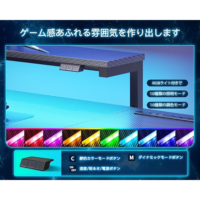 【LEDライト付きゲーミング机】デスクには、RGBライトを搭載しており、気分やシーンに合わせて色を切り替えることができます。10種類の照明モードと調色モードで、ゲーム環境の没入感をより高められます。ライトをオンにした時に最後のモードを維持するメモリー機能を備えています。毎日好きな色とモードを選択して、臨場感あふれるゲーム雰囲気を作り出します。
