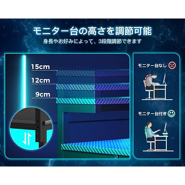 【モニター台は3段階調節可能】身長や使い方によって、高さは9cm、12cm、15cmの3種類からお選びいただけます。机のモニター台を利用して、目線をあげて姿勢を改善し、首や肩への負担を軽減!長期間のeスポーツゲームもテレワークも快適に!ヘッドホンフックもあり、ゲームと作業スペースがアップ、もっと楽に楽しめます。