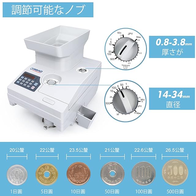 米国、カナダ、日本元、その他の外国のコインとトークンの厚さが0.8〜3.8mm以内、直径が14〜34mm以内のすべてをカウントできます。カウント速度:2300コイン/分(直径15mm、厚さ1mmのコインの場合)