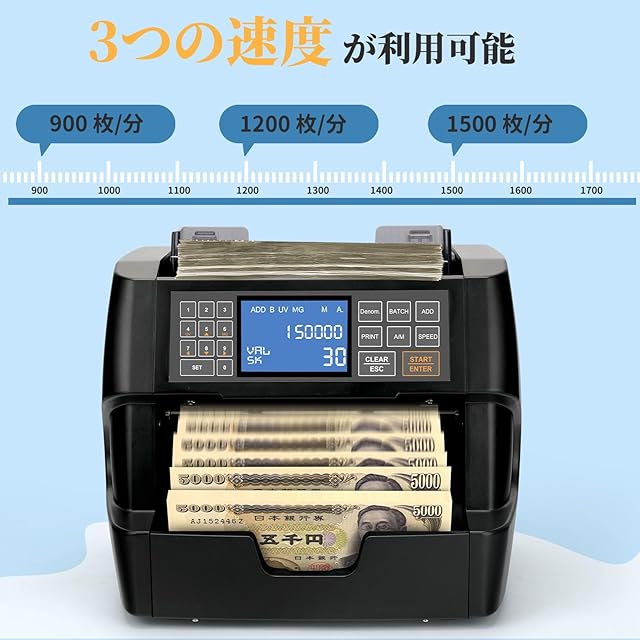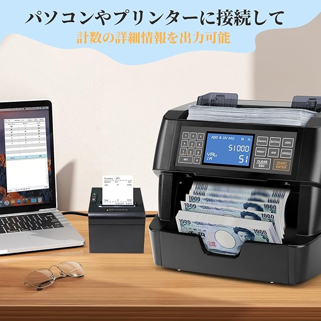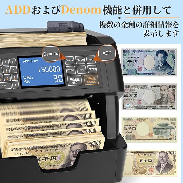 単一金種のカウント: この紙幣計数機は混合金種の計数機ではなく、特定の金種のみを認識して計数できることにご注意ください。 ADD モードでは、合計カウントに他の金種や金額を追加することができ、サーマル プリンターに接続してカウントデータを直接印刷することもできます