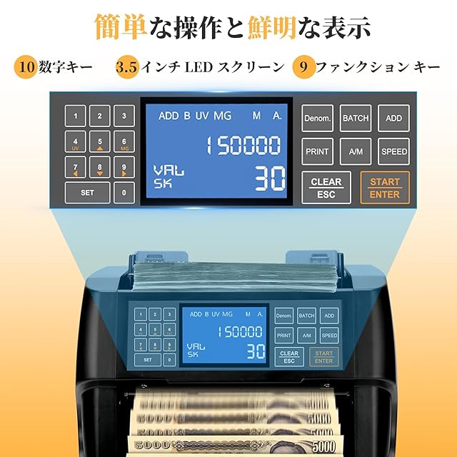 使いやすい: NUCOUN マネーカウンターには 10 個の数字キーと 9 個のファンクションキーが装備されており、バッチ番号を簡単に入力し、カウントモードを切り替えることができます。日本円紙幣を数えるために特別に設計されています